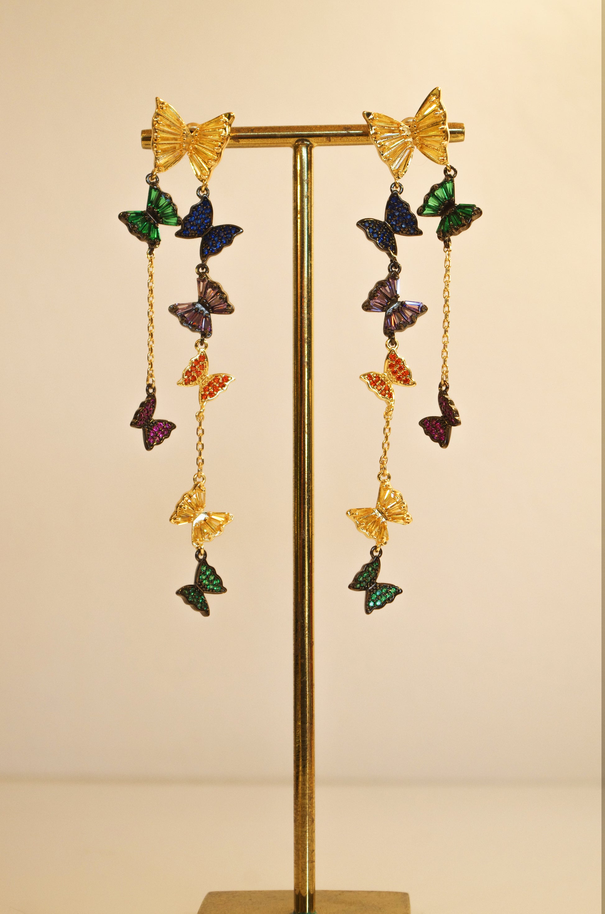Boucles d'Oreilles papillons multicolore en acier inoxydable et Crystal swarsovski baguette.